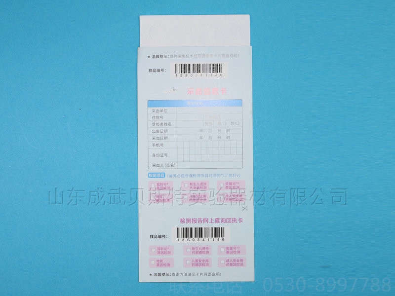 一、新生儿采血卡简介新生儿四环定制采血信息卡是由信息卡和滤纸两部分组成,采血部滤纸是由棉纤维作为载体,用于人体末梢血、唾液、体液、精斑的采集,便于DNA的储存和DNA的扩增实验,是DNA储存的新型介质,专门为室温下的各种生物体液,细胞培养液和病毒等样品进行收集,便于DNA的运输和储存而设计。信息卡部分由白卡纸印刷而成,记录采血人的详情信息,便于联系和追溯。