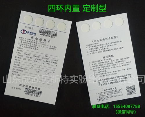新生儿四环内置采血卡简介:新生儿定制型四环内置采血卡是由信息卡和滤纸两部分组成,采血部滤纸是由棉纤维作为载体,用于人体末梢血、唾液、体液、精斑的采集,便于DNA的储存和DNA的扩增实验,是DNA储存的新型介质,专门为室温下的各种生物体液,细胞培养液和病毒等样品进行收集,便于DNA的运输和储存而设计。信息卡部分由白卡纸印刷而成,记录采血人的详情信息,便于联系和追溯。